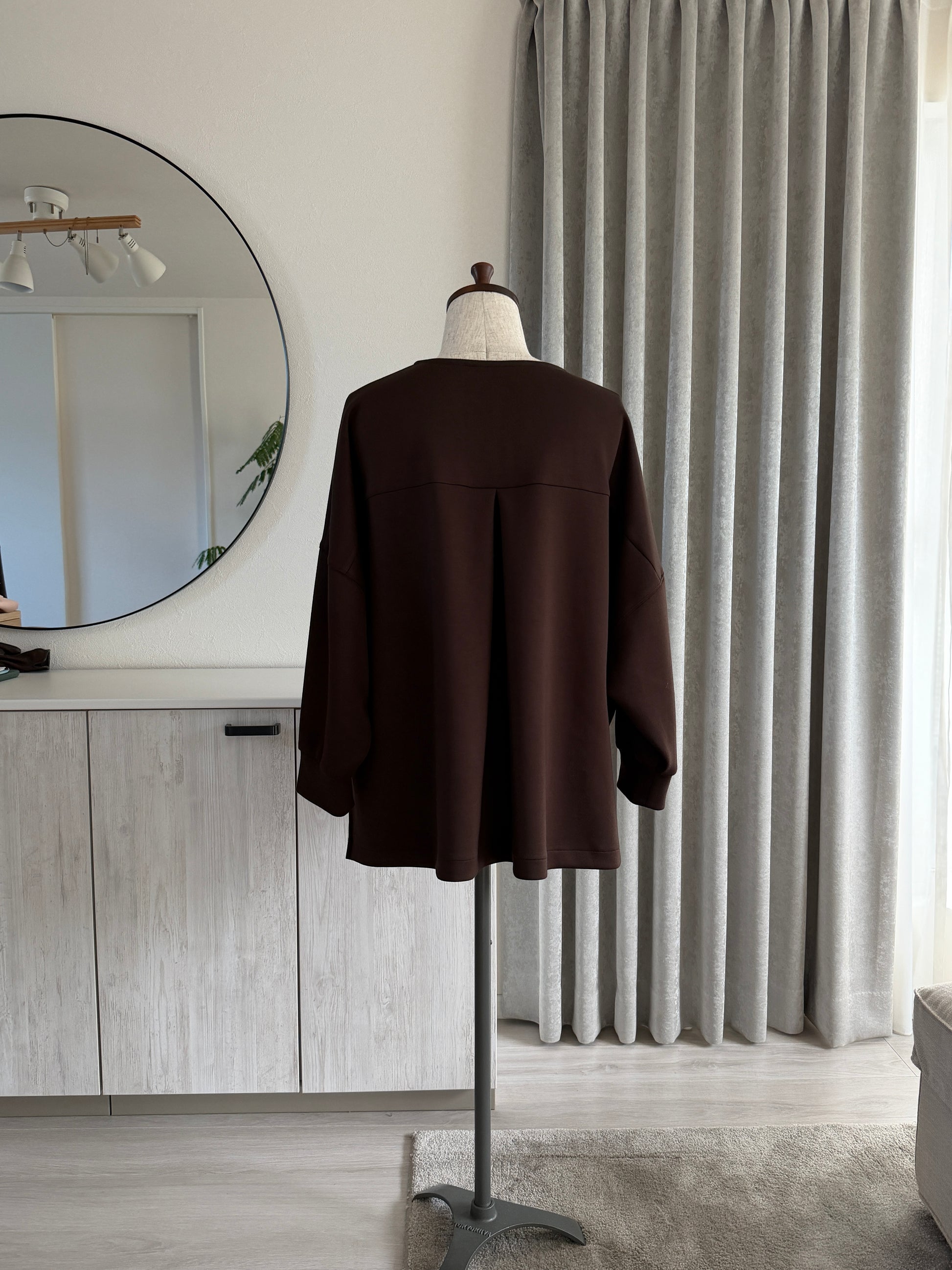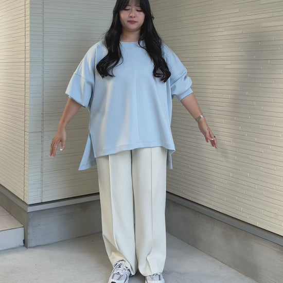 デイリーユースにぴったりな一枚で、どんなボトムスともバランスよくコーディネートしていただけます。ゆとりのあるボックスシルエットが、気になる部分をさりげなくカバーしつつ、心地よくお過ごしいただける着用感を叶えます。前後差のある丈感と、深めに入ったサイドスリットがポイント。前身頃の縦ステッチが縦ラインを強調し、背面のタックデザインが、後ろ姿にも自然な立体感をプラスし気になるお腹まわりや腰まわりもすっきりと見せてくれます。