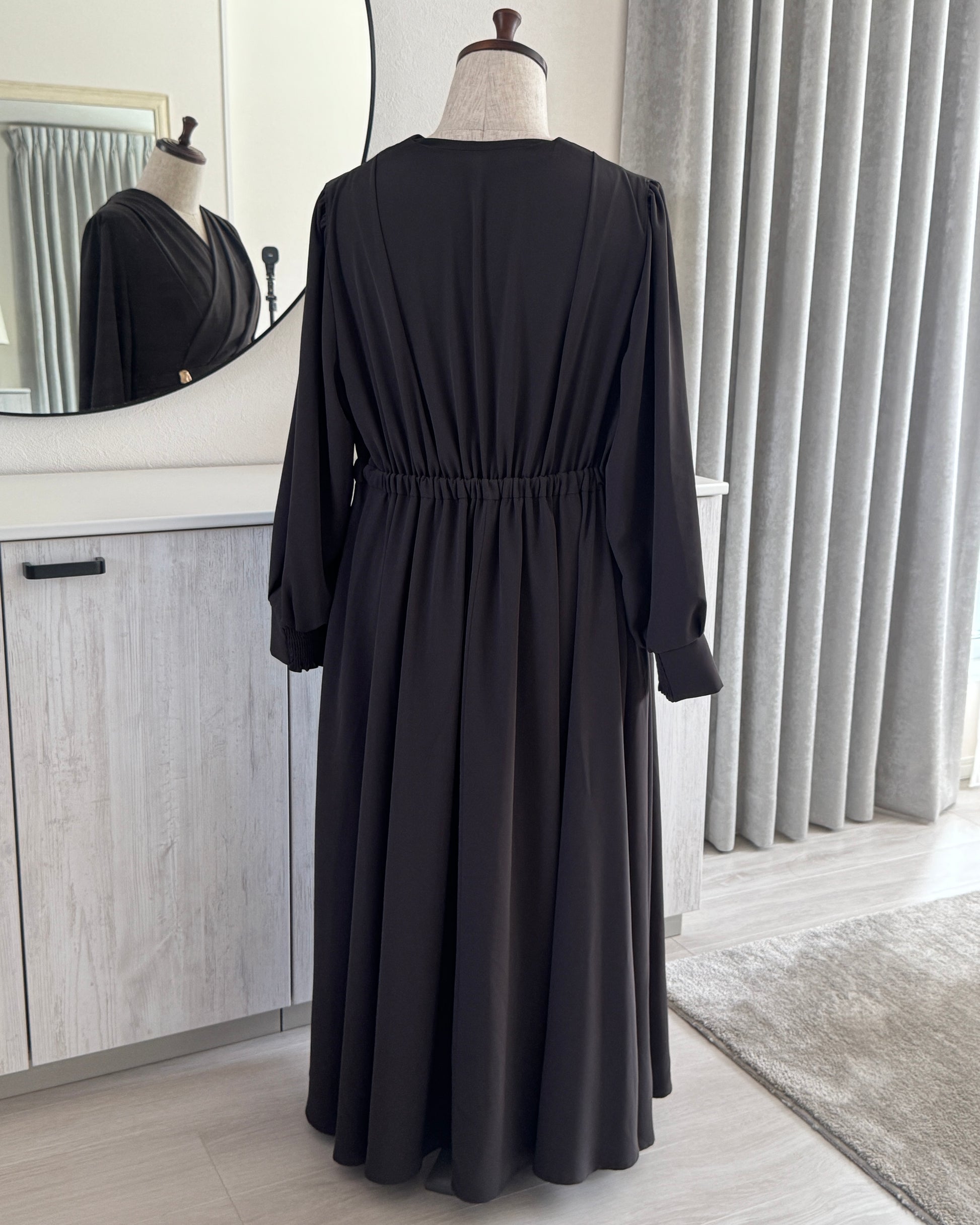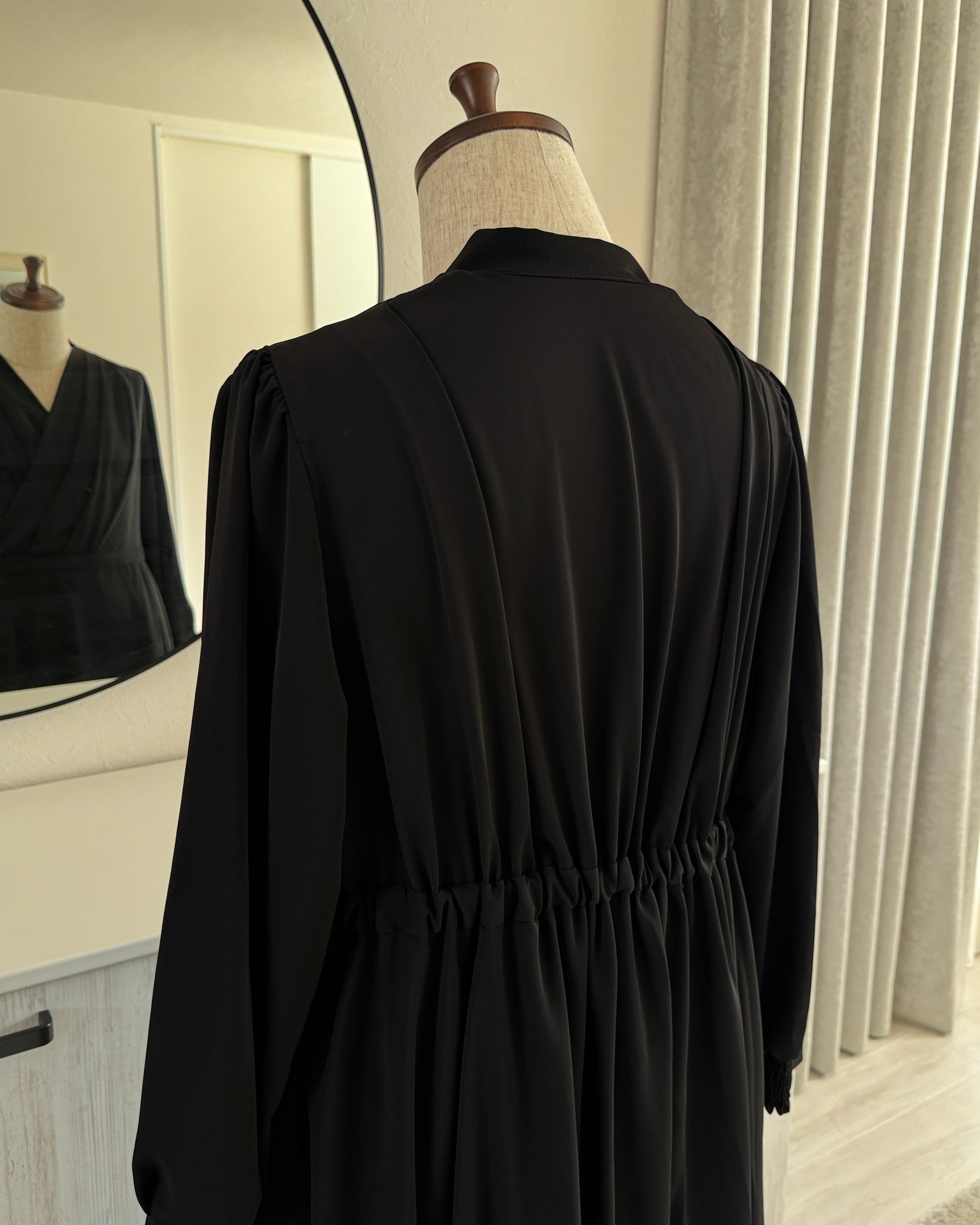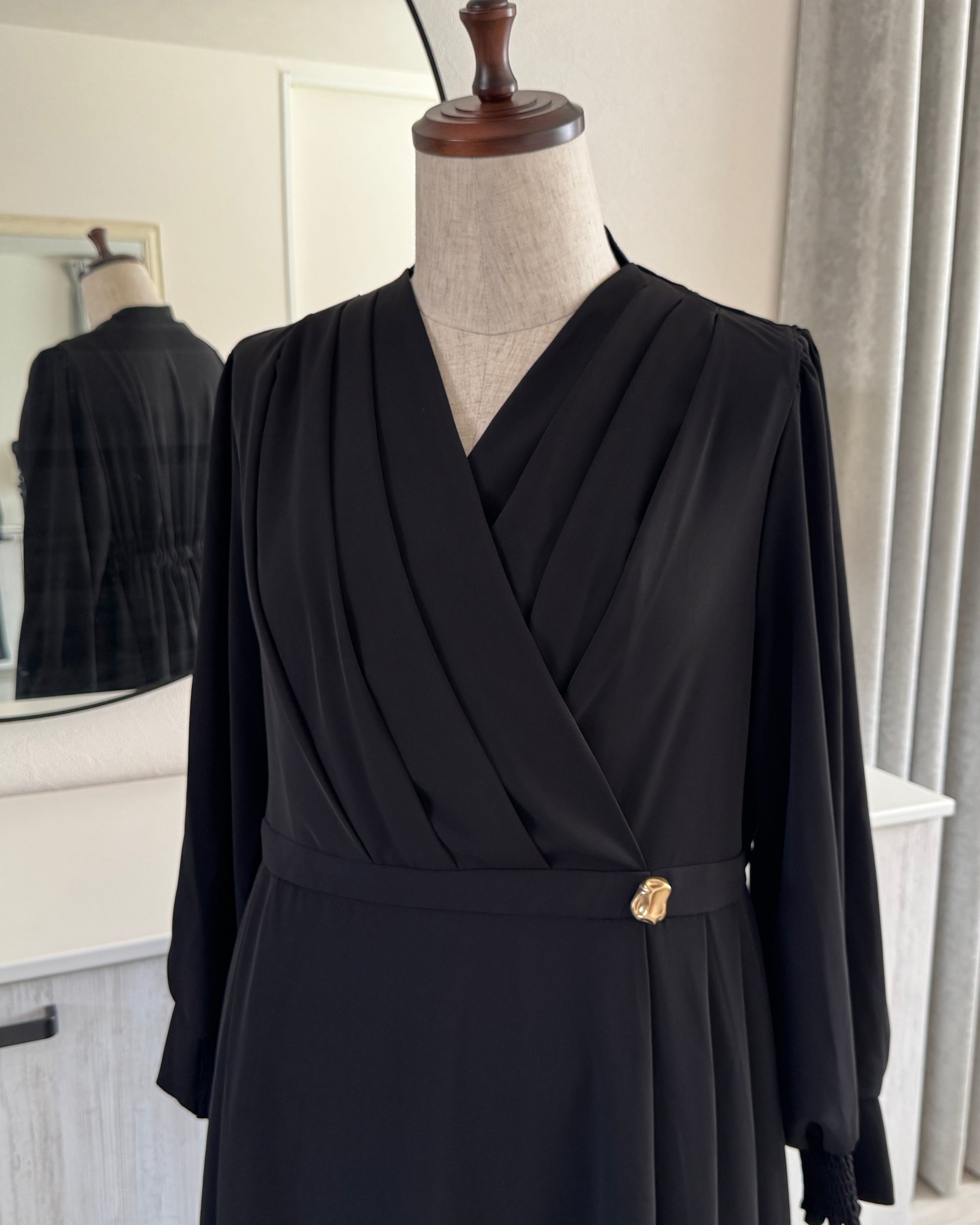 ・本商品の胸元のドレープ部分は、肩に入れたタックで立体感を表現しております。