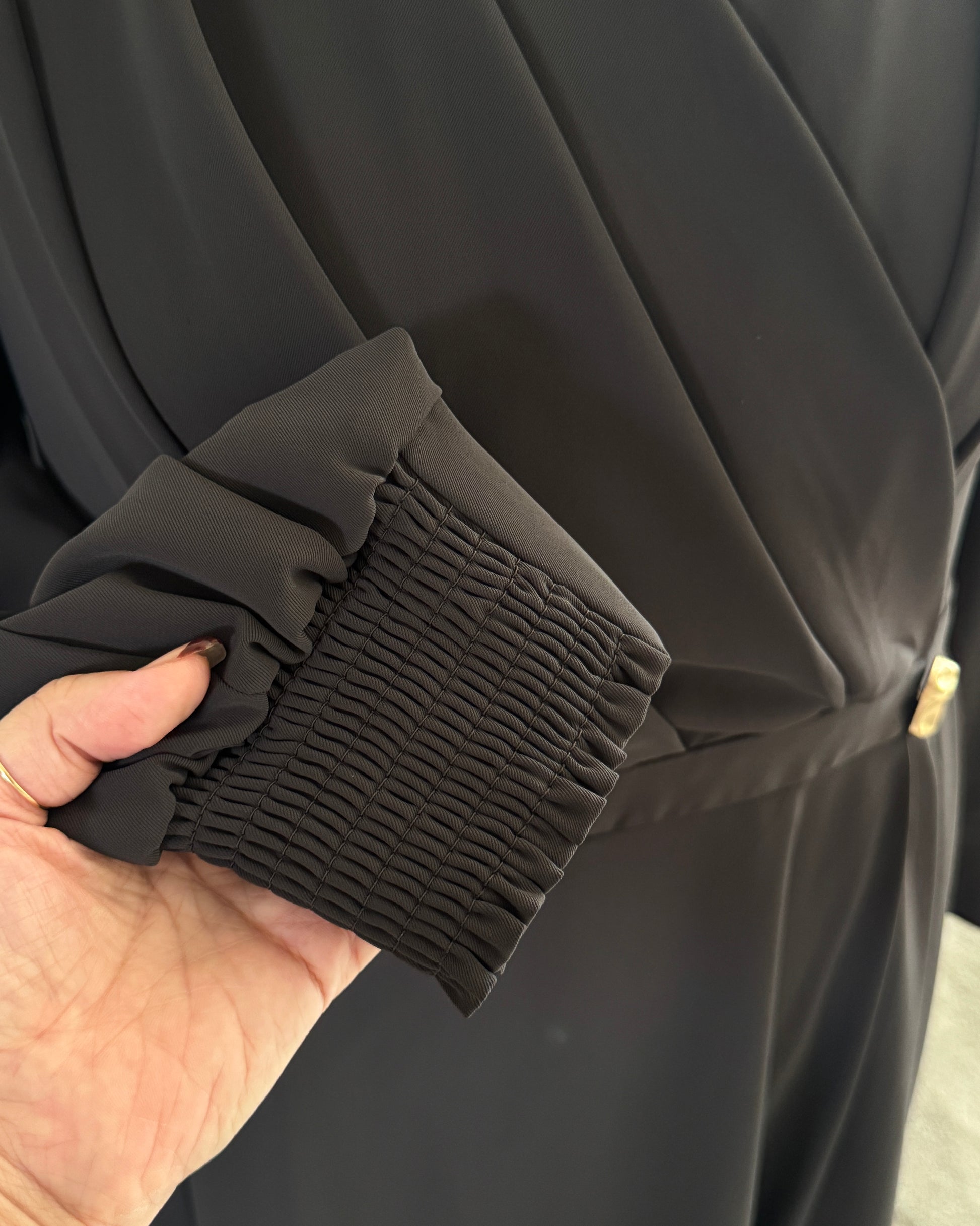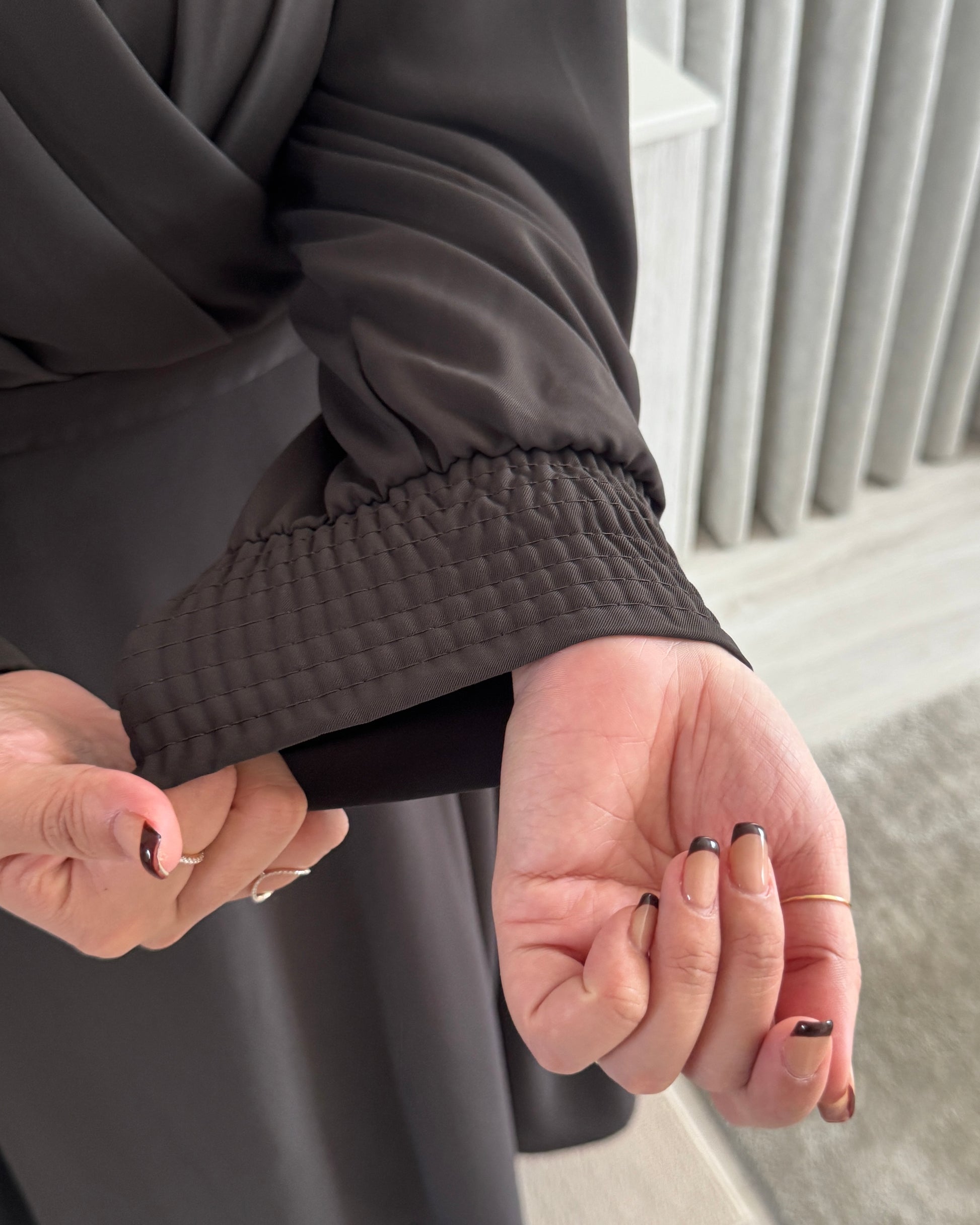 袖口はシャーリングゴム仕様で、締めつけ感なく快適に。