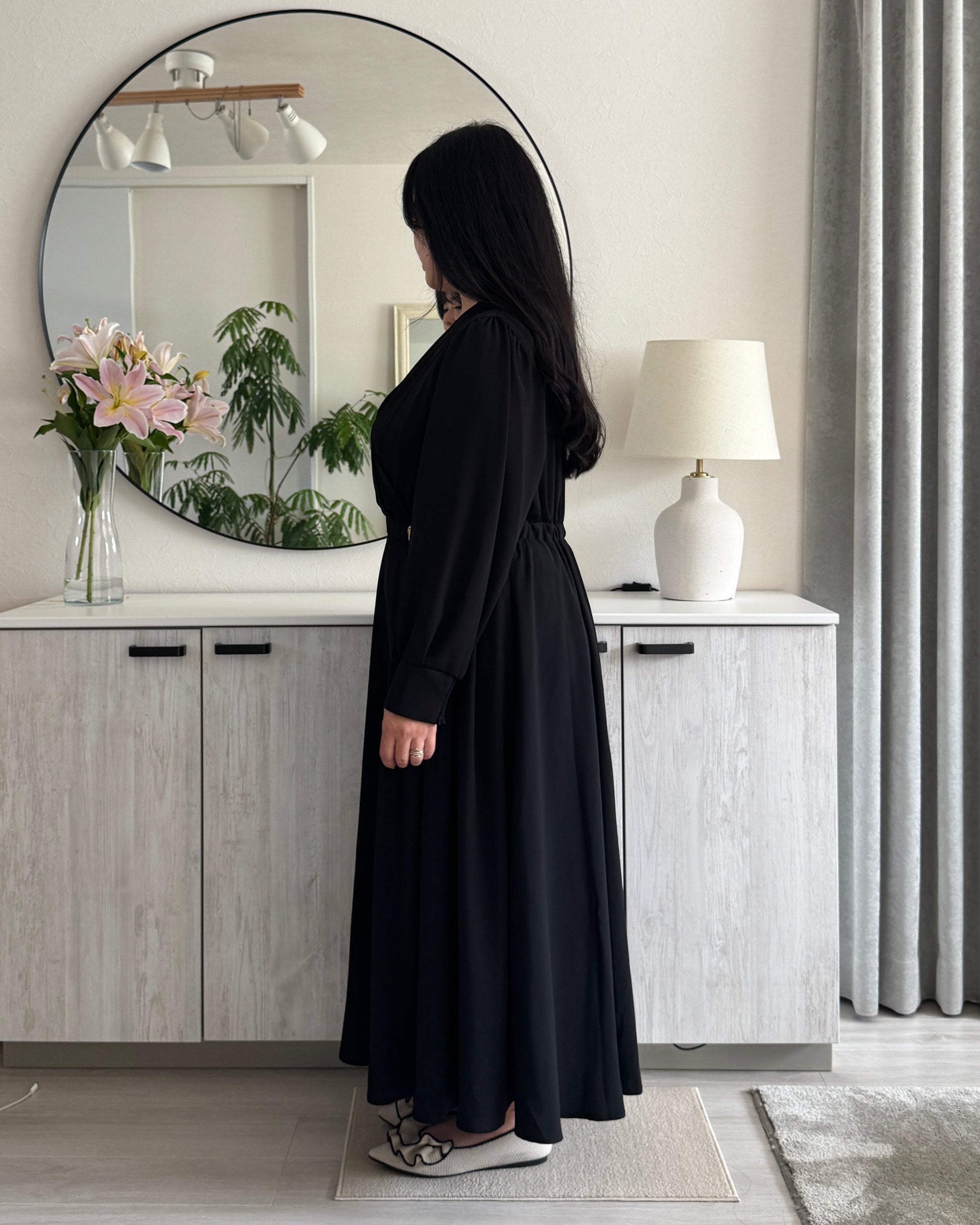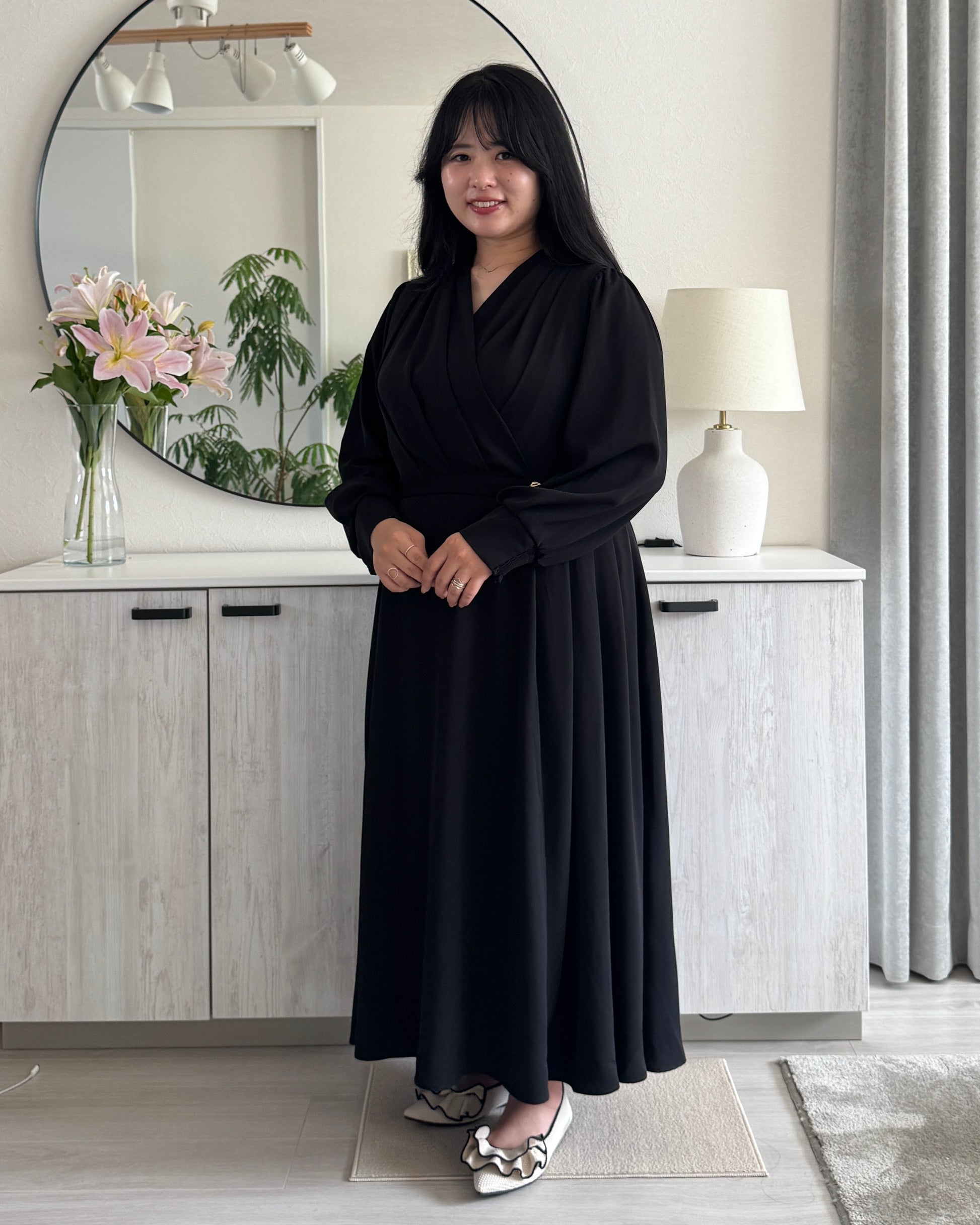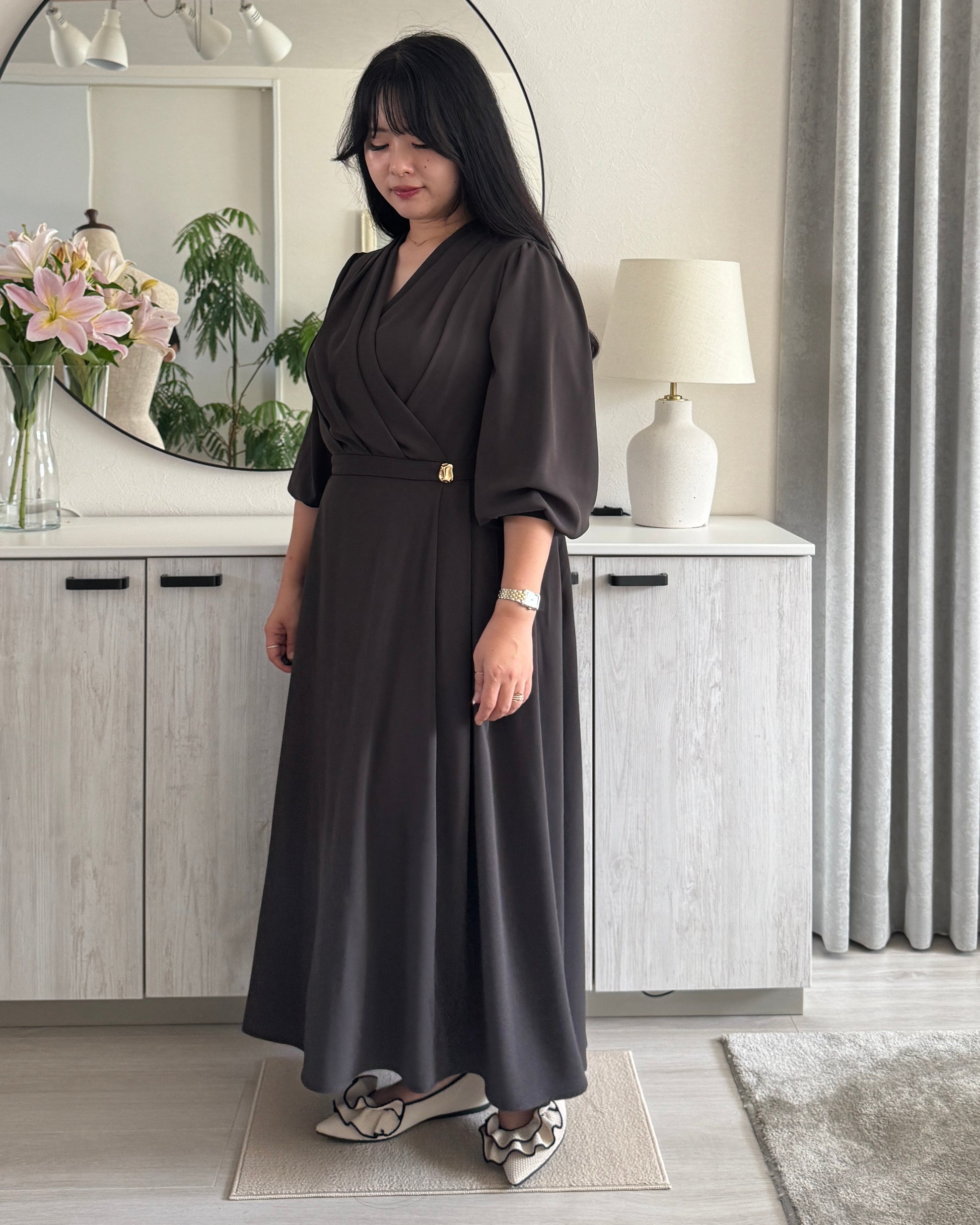 歩くたびにふわっと揺れるドレープが美しいシルエットを描きます。