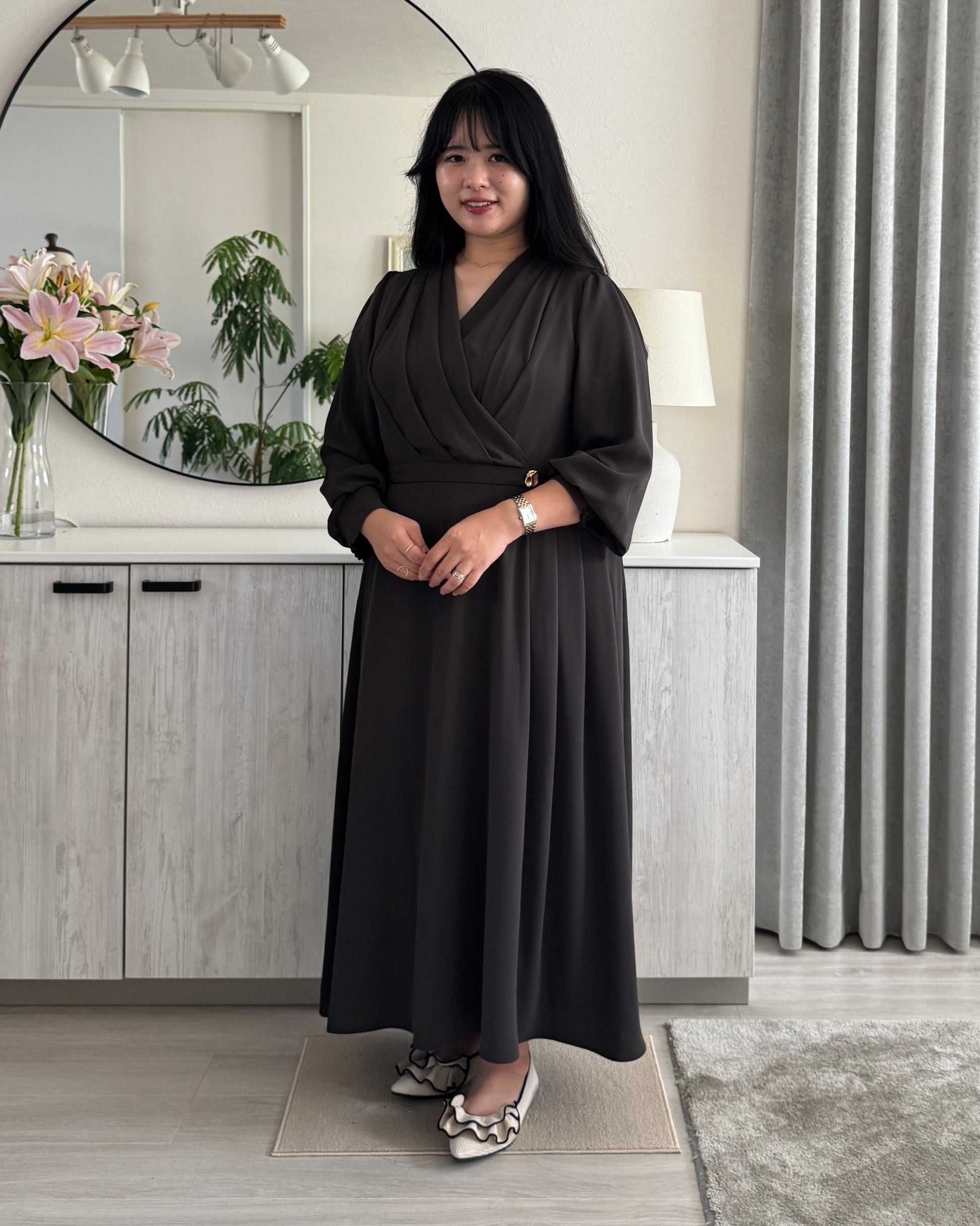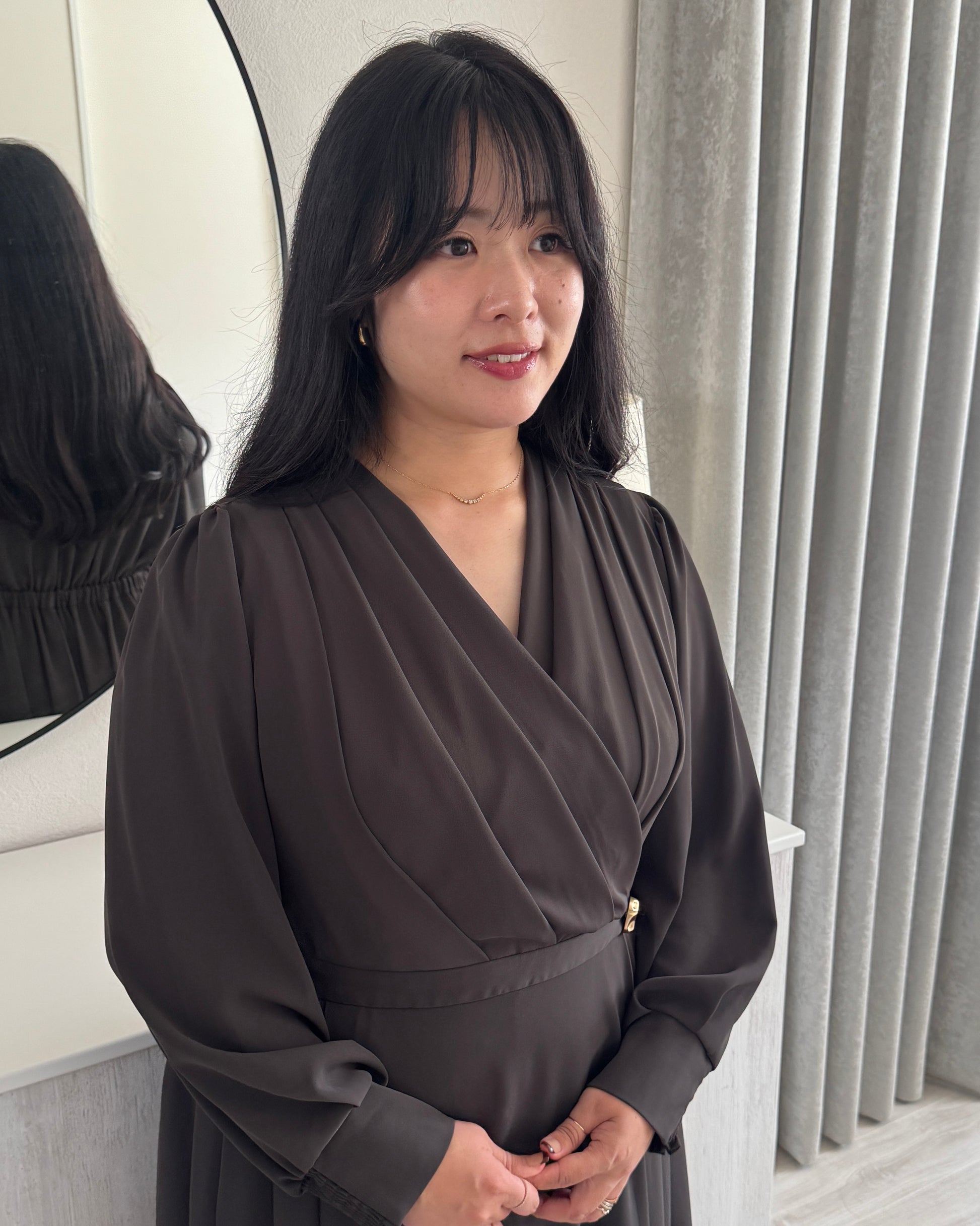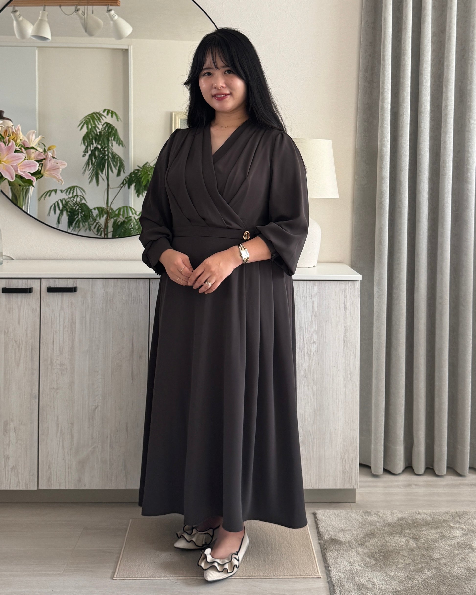 胸元はドレープ感のあるカシュクールデザインで仕立てました。